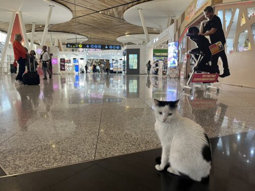 ラウンジを出ると、なんと免税店エリアにネコがうろついていました。